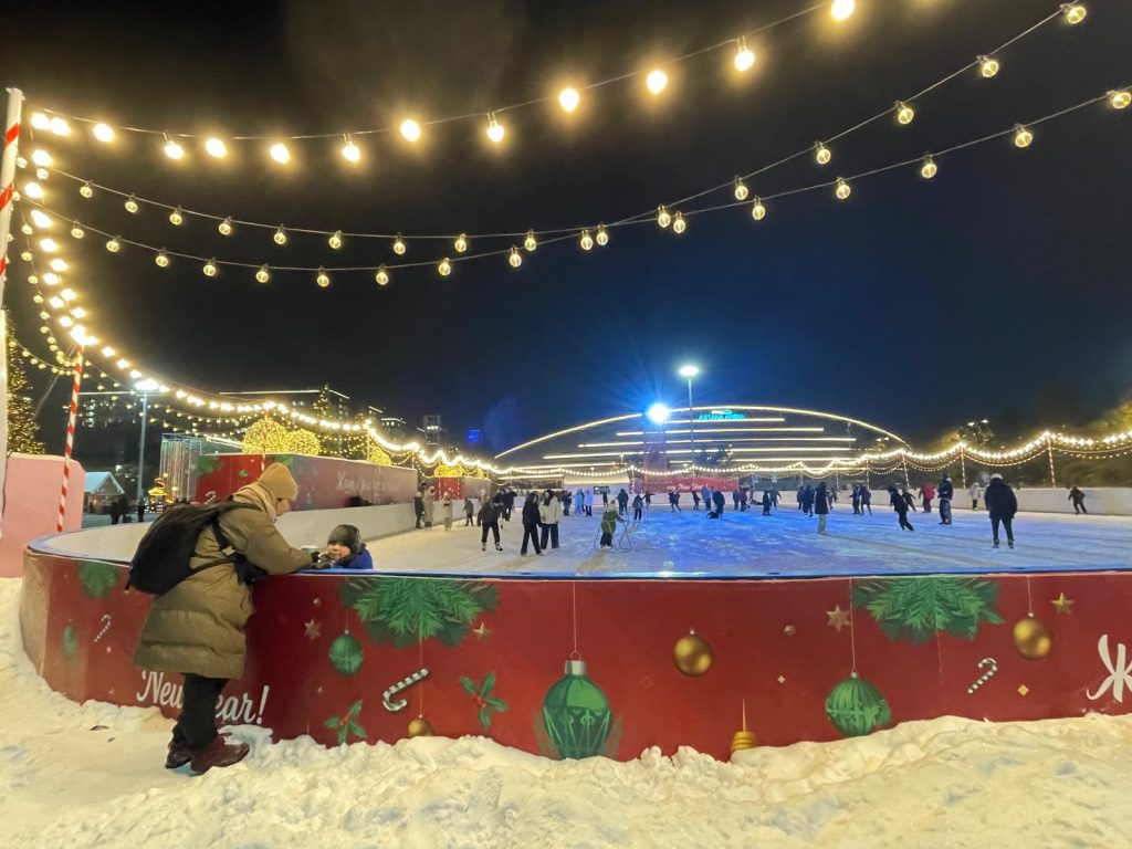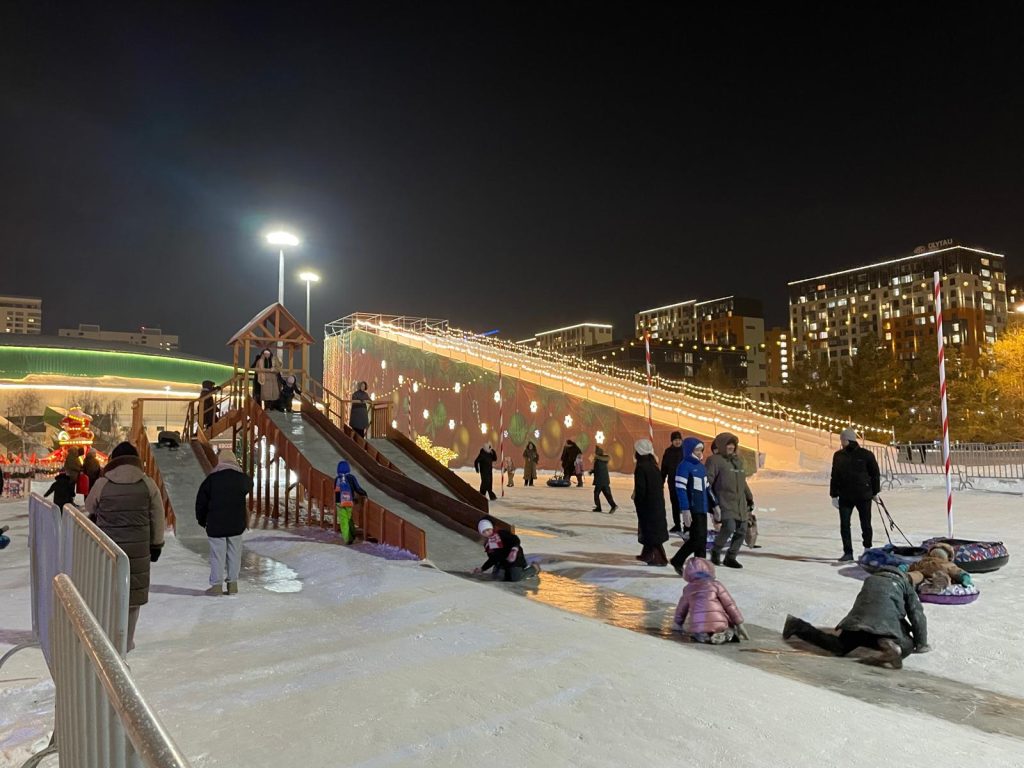 夜のアスタナでは、ネオンに照らされた公園がとても非現実的に見えます。