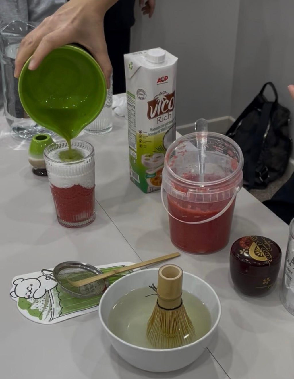 その後、参加者は3つのグループに分かれ、シンプルな抹茶ラテ、イチゴ味、マンゴー味のラテをそれぞれ作り、試飲するという内容でした。